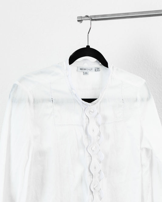 SEE BY CHLOE Cotton Ruffle Long Sleeve Button Down in White
