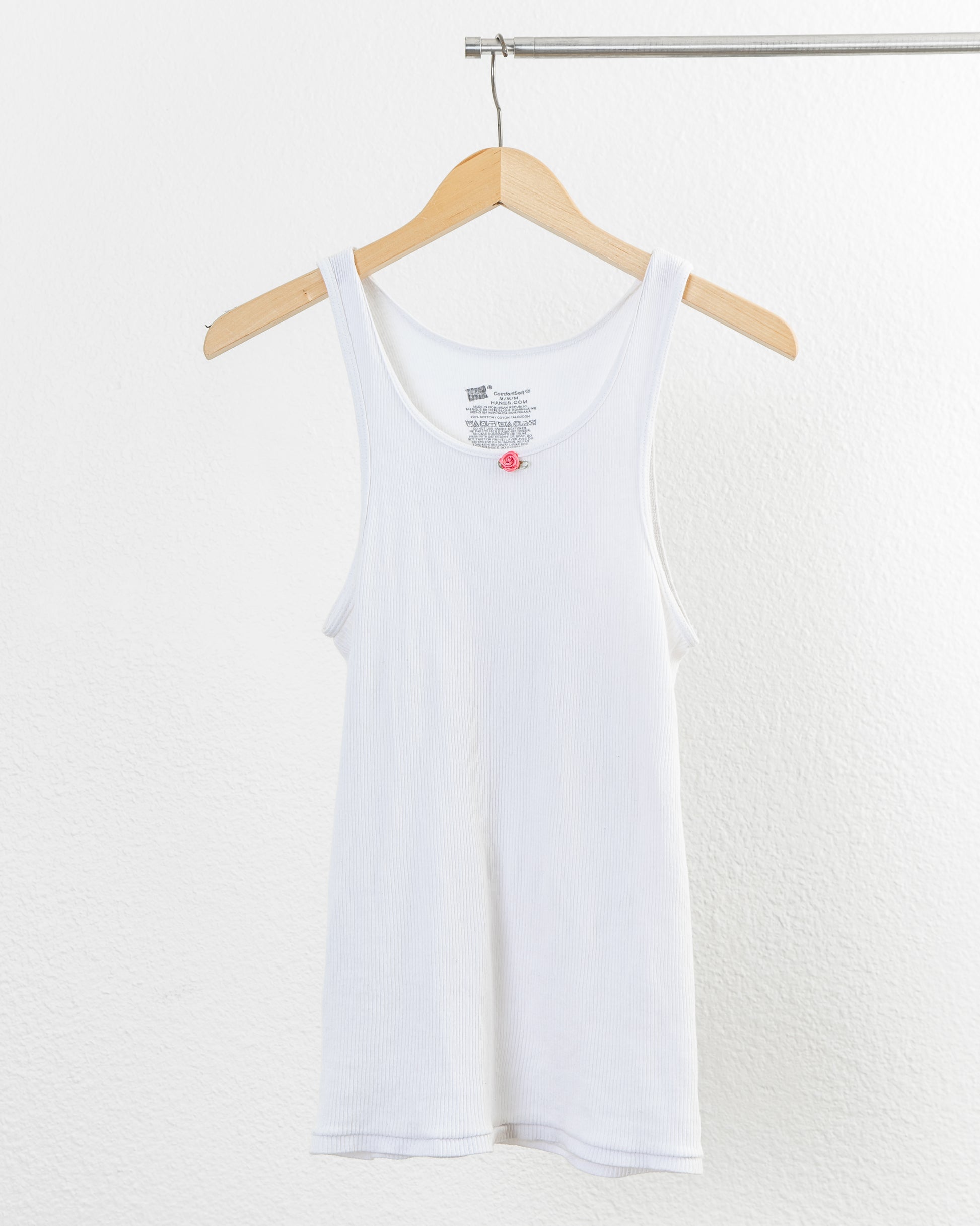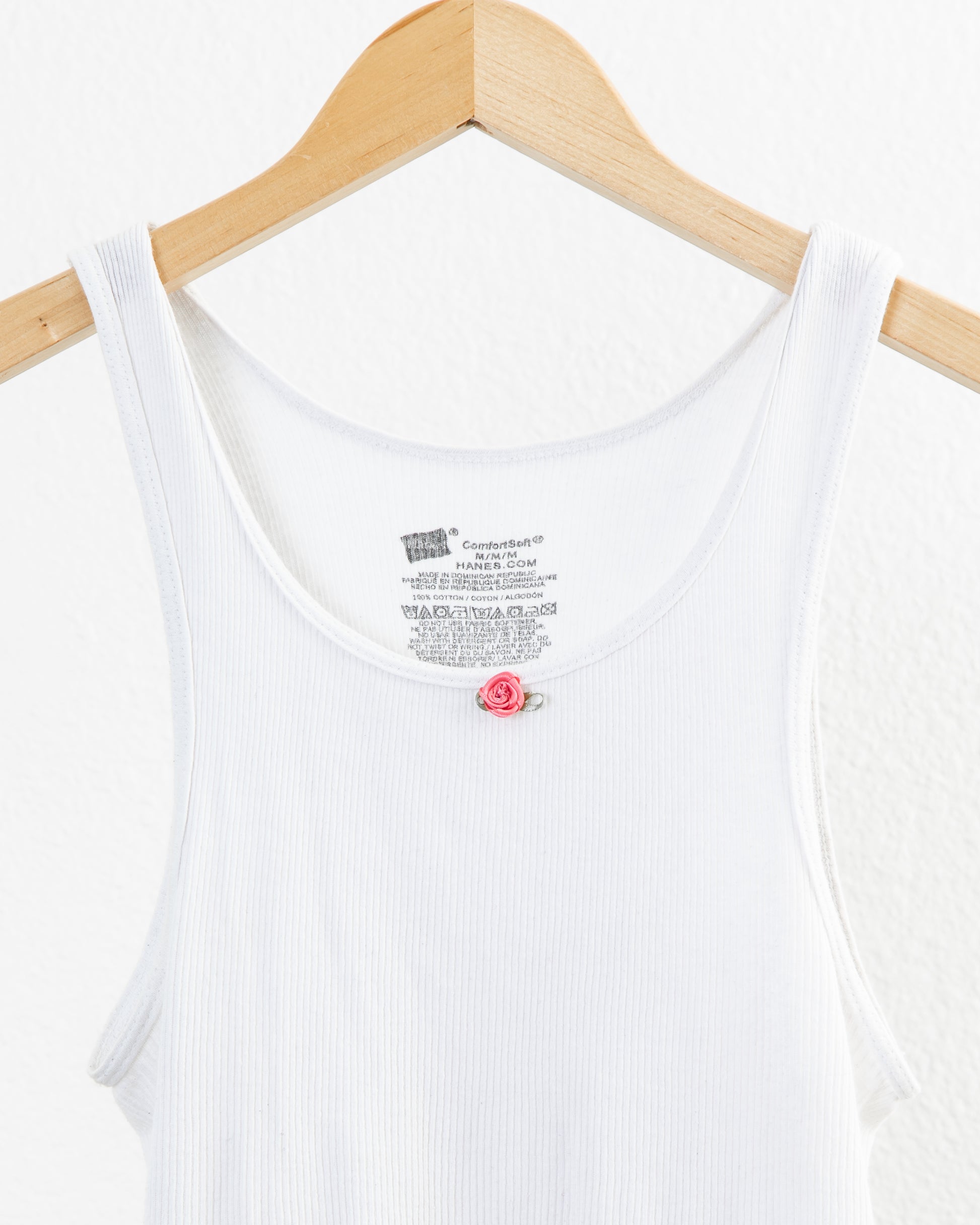 A basic cotton tank becomes femme fatale with the adornment of a perfect, pink rose.